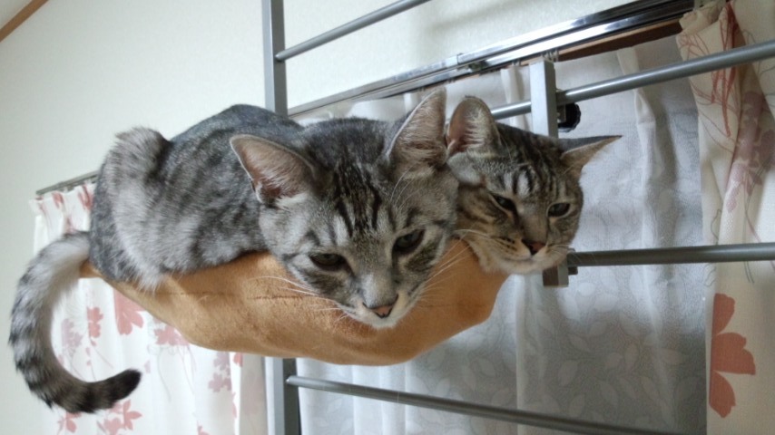 ハルがハンモックに居る所にアキが突入したのだと思われますが、一時間このまま粘って、ついにハルが追い出されました…体は小さくてもさすが兄。押しの強さはハンパないです(汗)