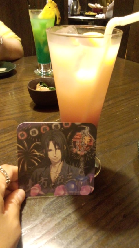 写真は土方さんのドリンク(ノンアルコール)。私はノンアルコール担当(飲めない)だったのでそっちで☆隊士をイメージしたドリンクを頼むと、コースターがついてくるんですよね~浴衣仕様でかっこかったです(^-^)胸元がセクシー!!!!