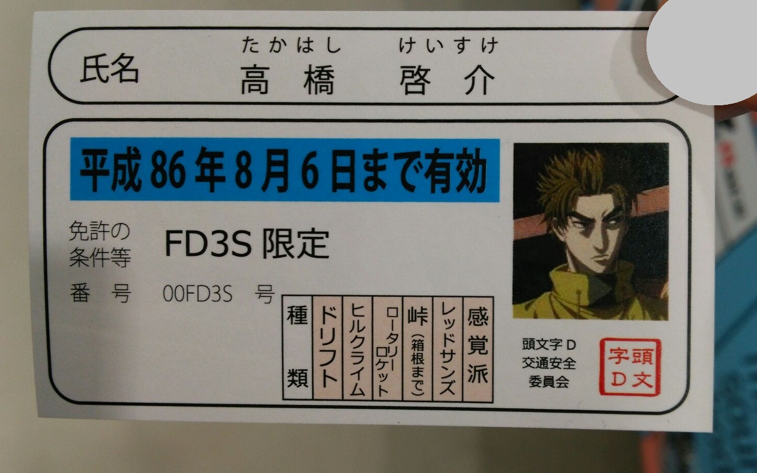 スタンプラリーはこんな感じで、全部回ると、免許証風のキャラカードがもらえます。啓介以外にも拓海とアニキが居ることは確認済です!