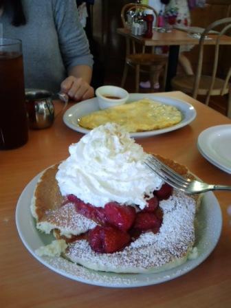 しかしこのボリューム!!これは奥に写っているオムレツについてくるパンケーキにホイップとストロベリーのトッピングを追加注文したバージョン。オムレツ+パンケーキ3枚で一人前です…。当然、1人前を二人で分けました(笑)ちなみに、パンケーキのみを注文すると5枚出てくるらしい!(ひい!)すんごいおいしいけど、一人で5枚は絶対食べきれんと思う…。