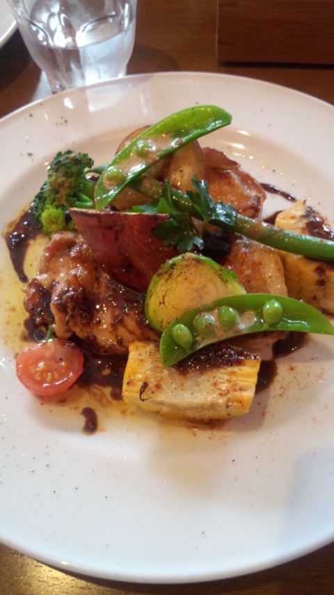 鶏肉をグリルしたやつに野菜がいっぱい乗ってて、バルサミコソースがかかってるのです…vv