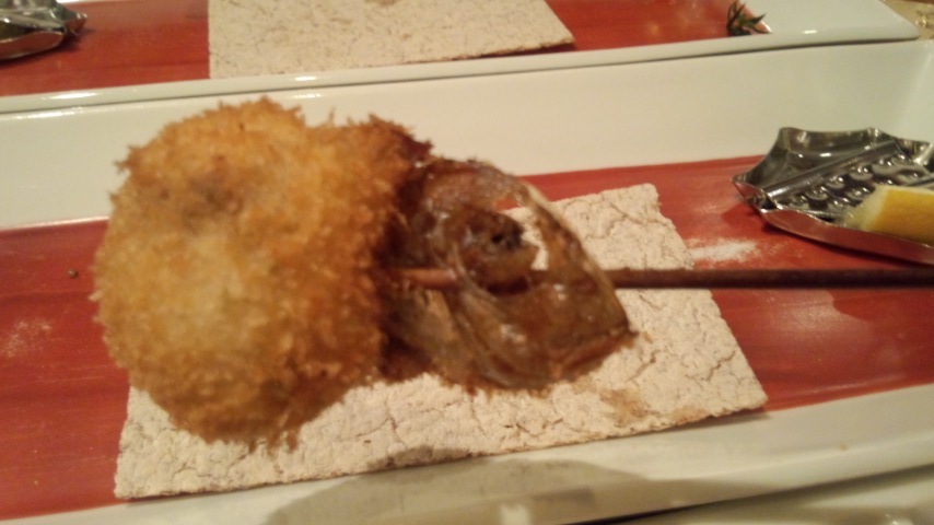 全20串なので全部は写真取ってないですが、豚や牛はもちろん、鮭、たこ、とんぶりなど海の幸や、ふきのとう、えんどう豆とかの春野菜など旬で新鮮な食材がいっぱい!小鯛なんて顔ついてるし!(写真参照)揚げたてをスタッフさんが一つずつもってきてくれるのです。めっちゃ美味でした~!!!!