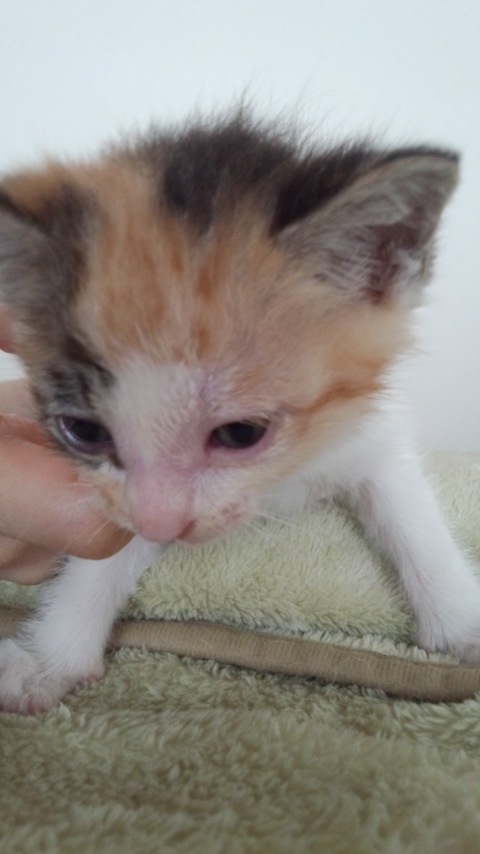 野良の仔だと思いますが、思いのほか見た目がきれいで目ヤニがあるのと猫風邪を引いてるかなーくらい。よたよた歩いてますがミルクもしっかり飲むし健康上はあんまり問題ないかなーと思われます。動物病院にもいったんですが、先生も大きな問題は無さそう、ということで一安心。
