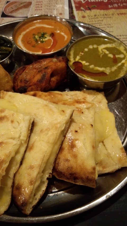 まずは、近所のカレー屋さん!インド人がされてるお店で本格インド料理が食べられます♪ナンが美味しいのですが、今回はチーズナンとカレー2種類のセットを頼みました。チーズナンはナンのなかにチーズがたっぷり!めっちゃ高カロリーっぽいけど、めっちゃ美味い~~~!!!!!し・あ・わ・せー!!