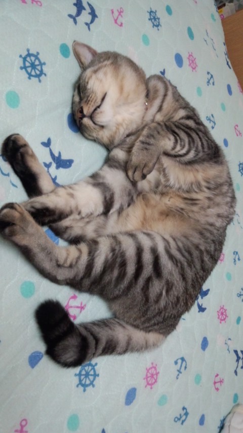 涼しくなってきたので、だんだん丸くなって寝始めていますが、まだ真丸くなって寝るには暑いようです…。