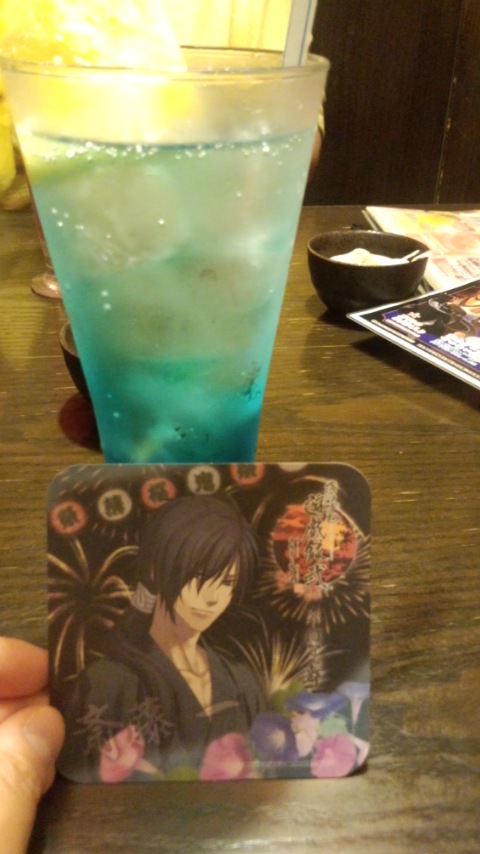 写真は土方さんのドリンク(ノンアルコール)。私はノンアルコール担当(飲めない)だったのでそっちで☆隊士をイメージしたドリンクを頼むと、コースターがついてくるんですよね~浴衣仕様でかっこかったです(^-^)胸元がセクシー!!!!