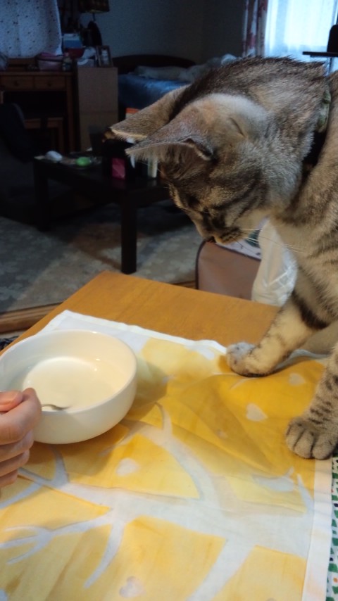 食へのあくなき探究心を持った食いしん坊にゃんこなので、人間の食べ物にも興味シンシンです。ヨーグルトはプレーンのものなら猫も食べられるので、ヨーグルトのふたを開けるとアキが飛んできます。ちなみにハルは人間の食べ物にほぼ興味なし。カリカリ命です(笑)