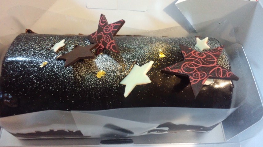 黒のロールケーキで、上に金箔?かなんかでキラキラ天の川が作られていて、さらに板チョコで☆が何個もついてるのです♪可愛いケーキでした。