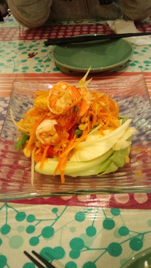 このエビのサラダ、むっちゃおいしかったです。ちょっと辛くて酸味があってさっぱり食べられました。